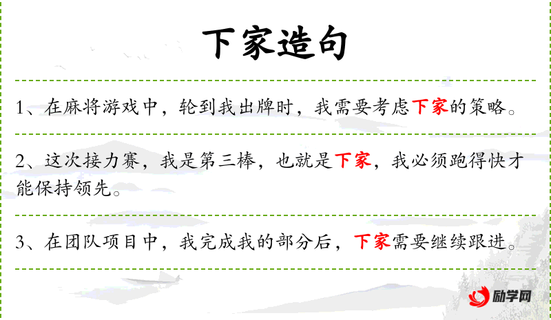 打牌﹑掷骰子﹑行酒令时在本人下位的人; 谦称自己的家; 指丈夫或婆家; 方言。犹角色‖贬义。