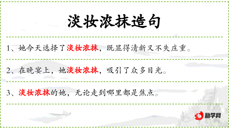 4. 【淡妆】 - 淡雅的妆饰;素淡地化妆:~浓抹。