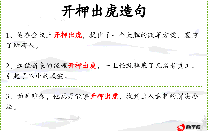 - 开柙出虎:这个成语源自古代,比喻采取大胆、冒险的行动。在文化中,成语的使用丰富了语言的表达,也反映了文化的深度。