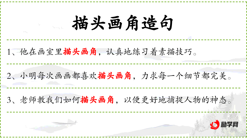 - 描头画角:指绘画时细致地描绘头部和角部,这里泛指细致的绘画过程。