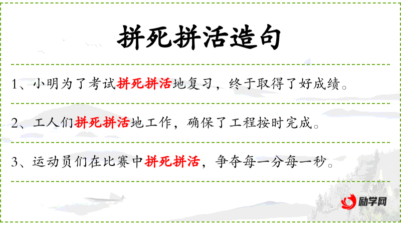 - 拼死拼活:形容非常努力、不顾一切地做事。