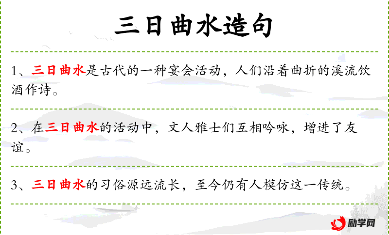 1. 【三日曲水】 - 指三月三日聚集在环曲水渠之旁进行的流觞宴饮活动。