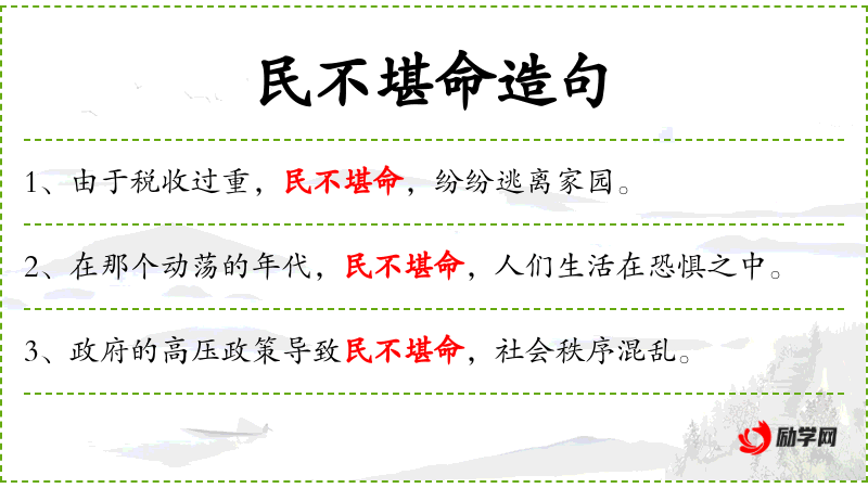 3. 【民不堪命】 - 堪:忍受;命:命令。民众负担沉重,痛苦得活不下去。