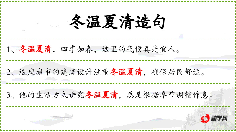 1. 【冬温夏清】 冬天使父母温暖,夏天使父母凉爽。指人子孝道。亦泛称冬暖夏凉。