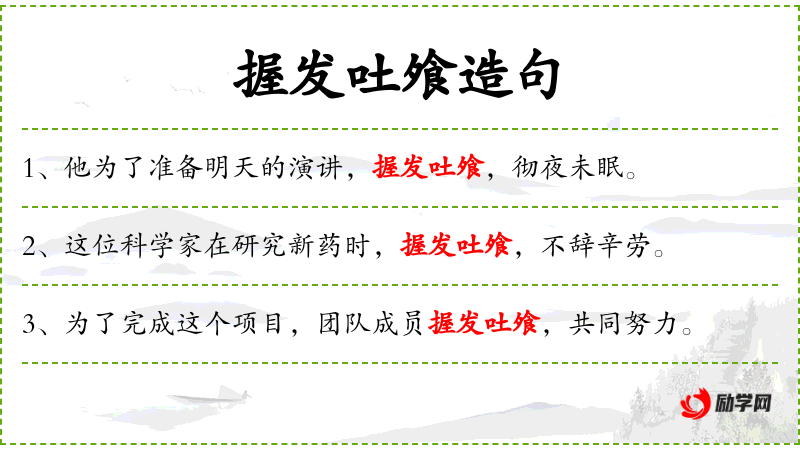- 握发吐飧:这个成语来源于古代,反映了人对于勤奋和努力的重视。