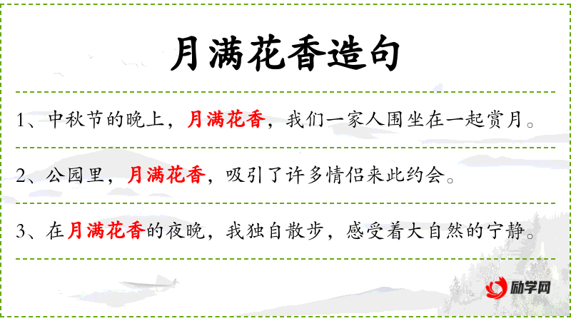 1. 【月满花香】 - 明月正圆,百花飘香。指良辰美景。