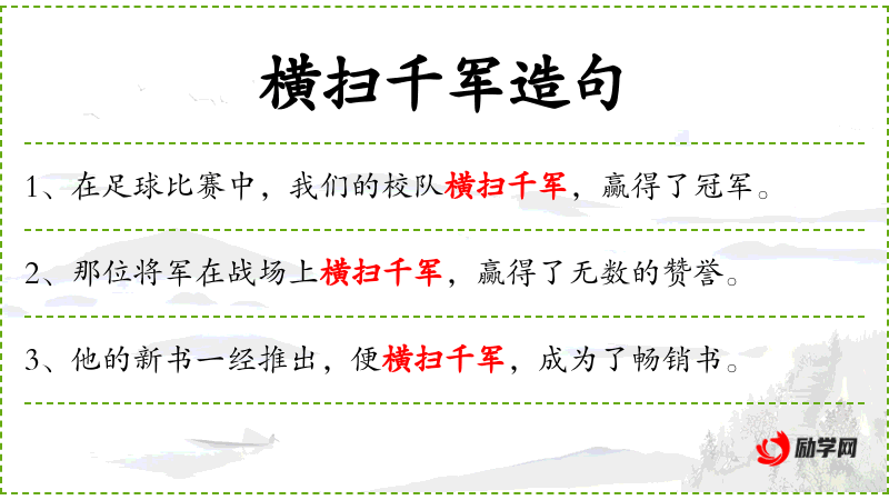 2. 【横扫千军】 - 横扫:扫荡、扫除。把大量敌军象扫地似地一阵子扫除掉。