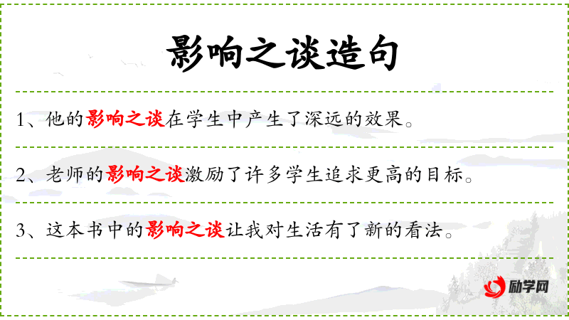- 影响之谈:指某人的言论或观点对他人产生的影响。