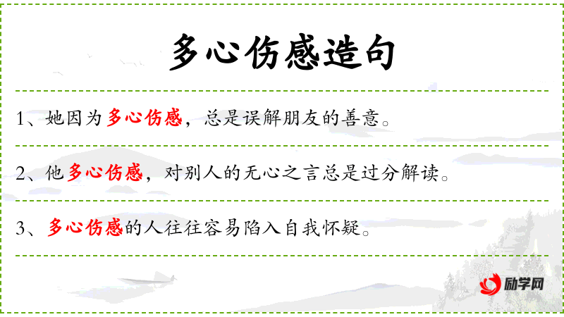 1. 【多心伤感】 多心:多疑心。因多疑而引起悲伤。