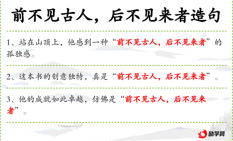 - 前不见古人,后不见来者:成语,形容某种思想或成就非常独特,前无古人,后无来者。