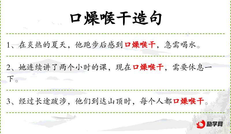 - 口燥喉干:形容口渴和喉咙干燥的感觉。