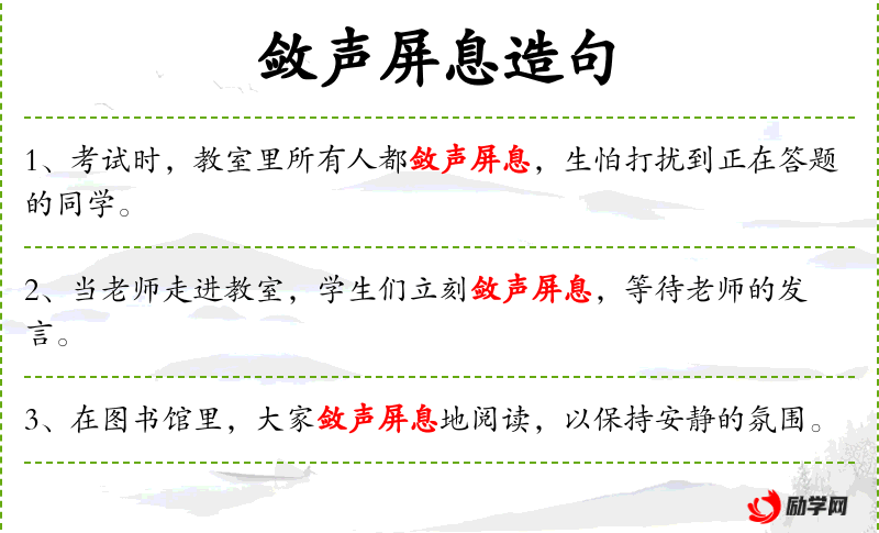 - 敛声屏息:形容非常安静,不敢发出声音,屏住呼吸,常用于形容紧张或期待的情境。