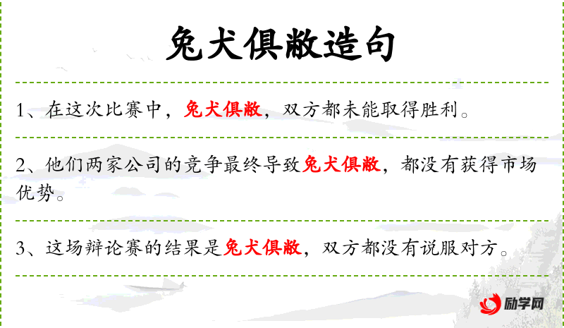 - 成语:“兔犬俱敝”源自**古代的寓言故事,用来比喻双方都受到损失。