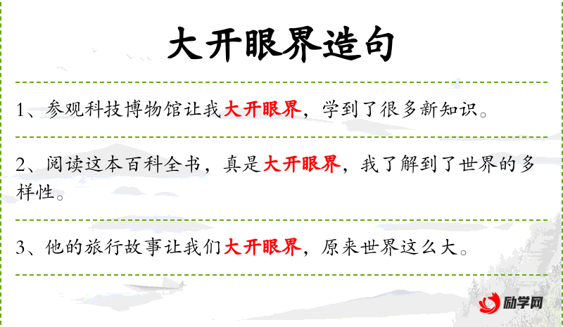 - “大开眼界”是一个常用的汉语成语,反映了中华文化中对知识和经验积累的重视。