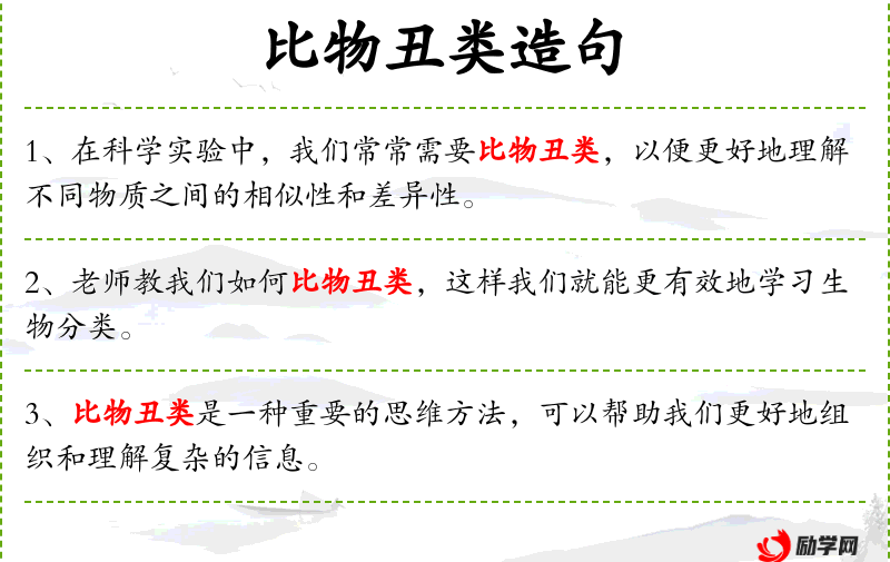 1. 【比物丑类】 指连缀同类事物,进行排比归纳。
