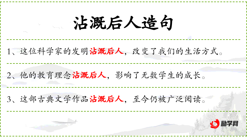 5. 【沾溉后人】 沾溉:沾润灌溉,引申为使人受益。使后来人得到好处