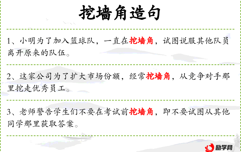 - 成语:“挖墙角”是一个常用的成语,用来形容不正当的竞争手段。