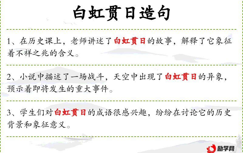 1. 【白虹贯日】 白色的长虹穿日而过。古人认为人间有不平凡的事,就会引起这种天象的变化。实际上这不是虹而是晕,是一种大气光学现象。