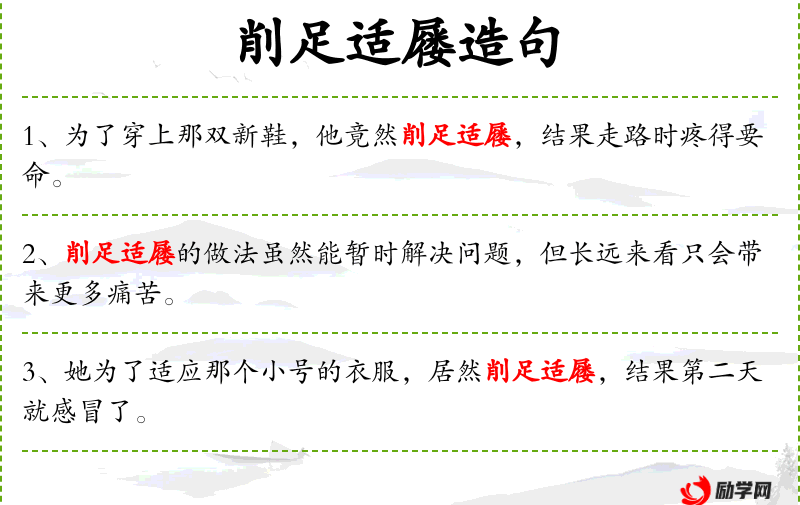 - 削足适屦:这是一个成语,意思是削短脚趾以适应鞋子,比喻不合理的迁就或勉强凑合。