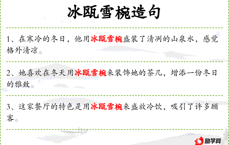 句子:“她喜欢在冬天用冰瓯雪椀来装饰她的茶几,增添一份冬日的雅致。”