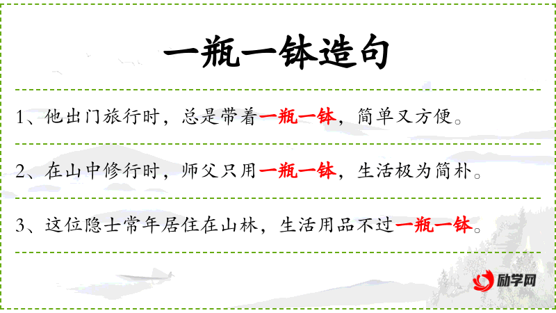 1. 【一瓶一钵】 - 瓶、钵:和尚盛饮食的器具。指和尚云游时携带的最简单的食器。也比喻家境贫穷,生活简朴。