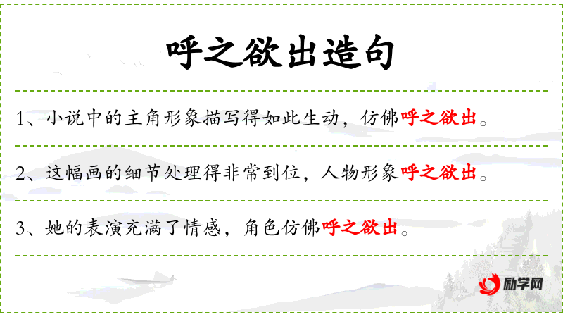 - 呼之欲出:这个成语源自**古代文学,形容描写得非常生动,形象跃然纸上。