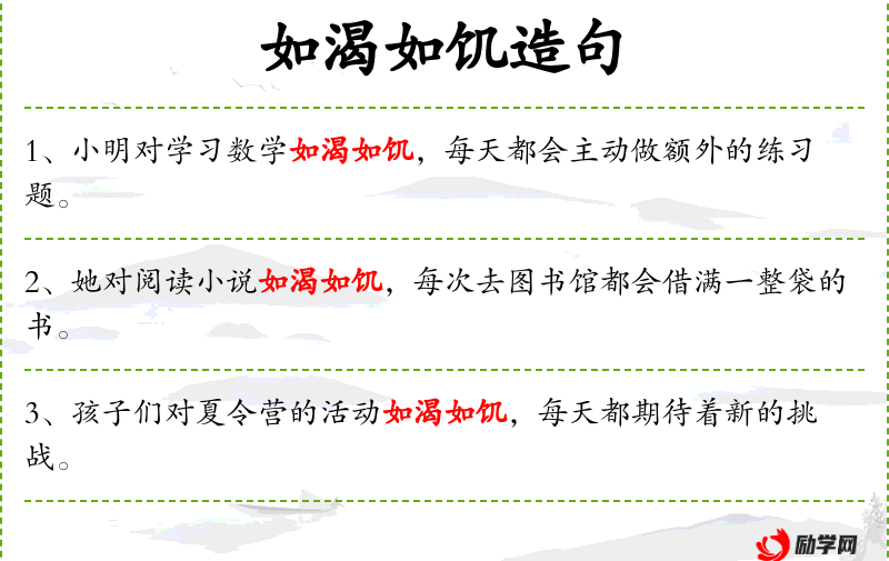 - “如渴如饥”是一个成语,形容对某事物的渴望非常强烈。