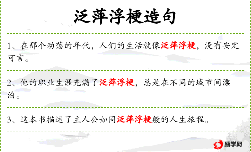 1. 【泛萍浮梗】 - 浮动在水面的萍草和树根。比喻踪迹漂泊不定。