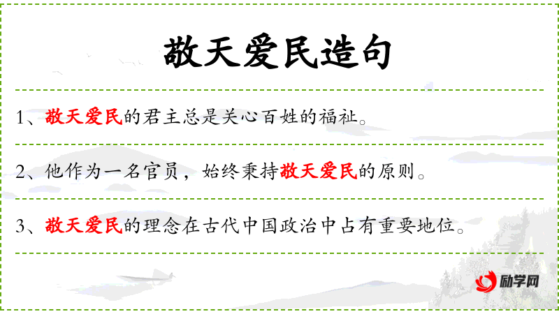 - 敬天爱民:名词短语,表示尊敬上天和爱护人民。