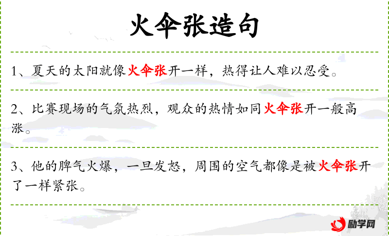 4. 【火伞张】 火伞:比喻烈日;张:展开。形容夏天烈日当空,酷热难耐。