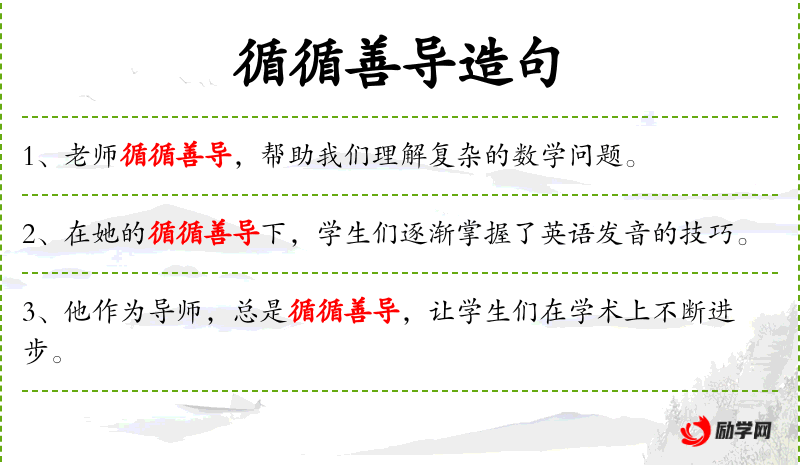 1. 【循循善导】 循循:有次序的样子;善:善于;导:引导。指善于引导别人进行学习。