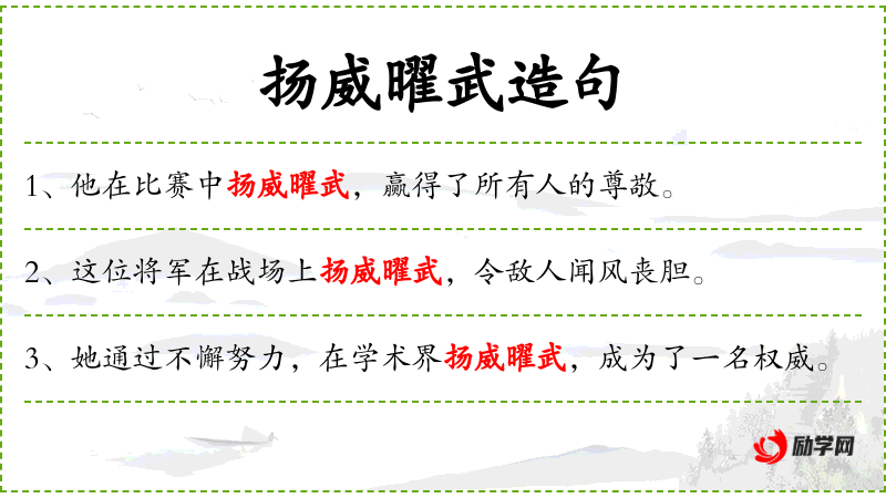 1. 【扬威曜武】 炫耀武力,显示威风。