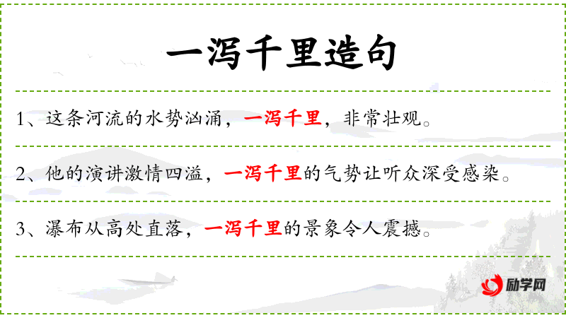 1. 【一泻千里】 泻:水往下直注。形容江河奔流直下,流得又快又远。也比喻文笔或乐曲气势奔放。也形容价格猛跌不止。