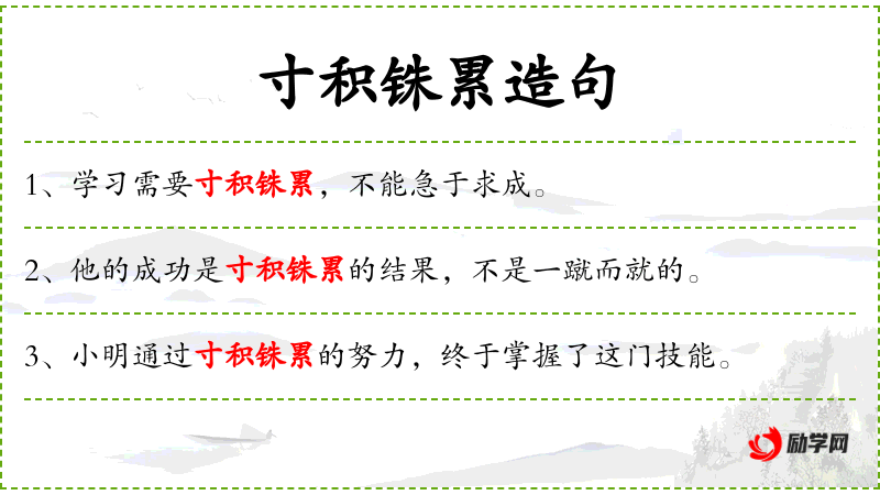 - 寸积铢累:成语,形容一点一滴地积累。