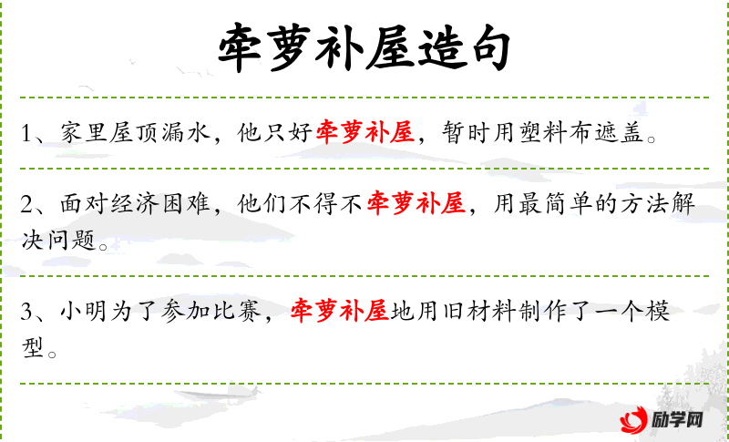 2. 【牵萝补屋】 - 萝:女萝,植物名。拿藤萝补房屋的漏洞。比喻生活贫困,挪东补西。后多比喻将就凑合。