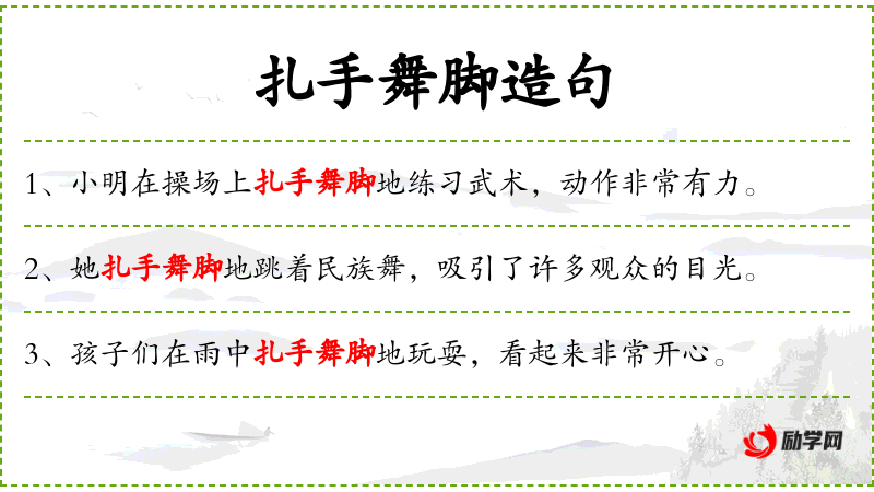 - 扎手舞脚:形容动作夸张、活泼,可能带有一定的贬义或戏谑意味。