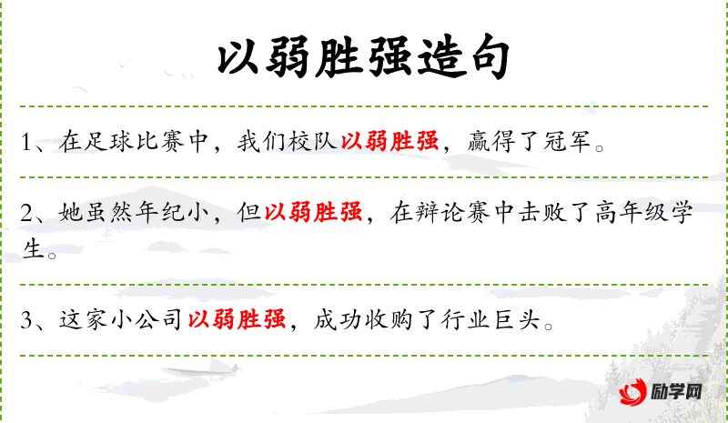 - 以弱胜强:这个成语在文化中常用来形容弱者通过努力和智慧战胜强者,体现了人崇尚的“以柔克刚”的哲学思想。