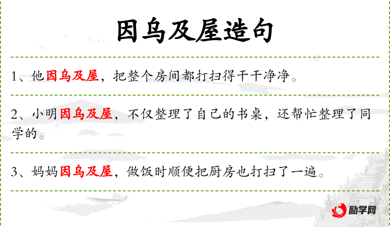 句子:“孩子们因乌及屋,画画时把整个画室都装饰了一番。”