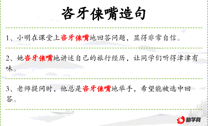 句子:“小明在课堂上咨牙俫嘴地回答问题,显得非常自信。”