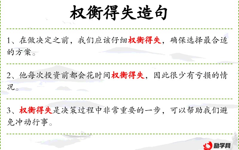 1. 【权衡得失】 权:秤砣;衡:秤杆;权衡:比较,衡量;得失:所得和所失。比喻考虑办一件事的成果和损失。