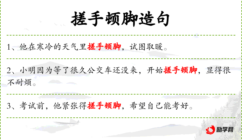 - 搓手顿脚:动词短语,表示焦虑或不安的动作。