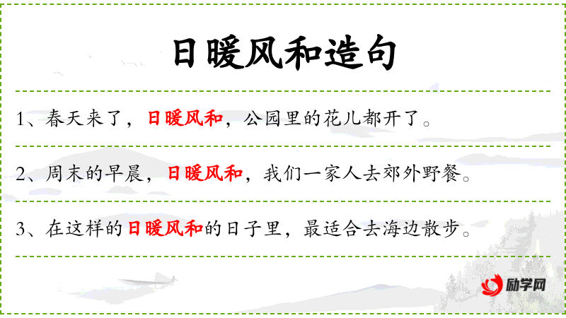 - 日暖风和:风和日丽、天气晴好