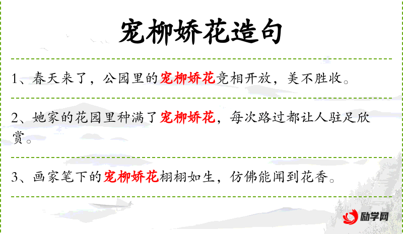 - 宠柳娇花:形容词,形容柳树和花朵的美丽和娇嫩。