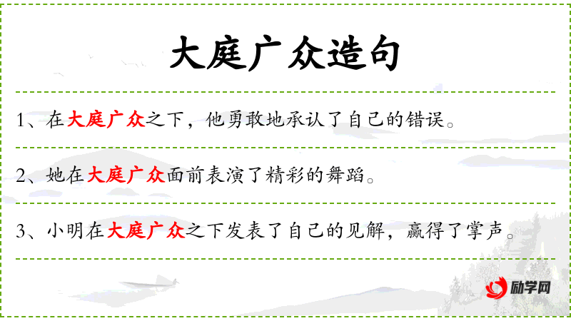 1. 【大庭广众】 大庭:宽大的场地;广众:为数很多的人群。指聚集很多人的公开场合。