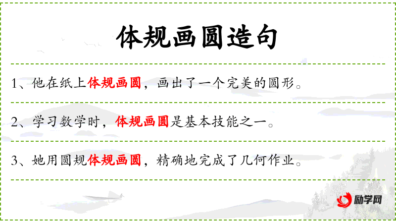 - 体规画圆:动词短语,表示按照一定的规则或方法画圆。