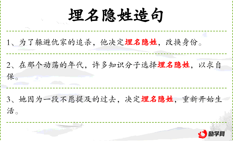 3. 【埋名隐姓】 隐:隐瞒。隐瞒自己的真实姓名,不让别人知道。