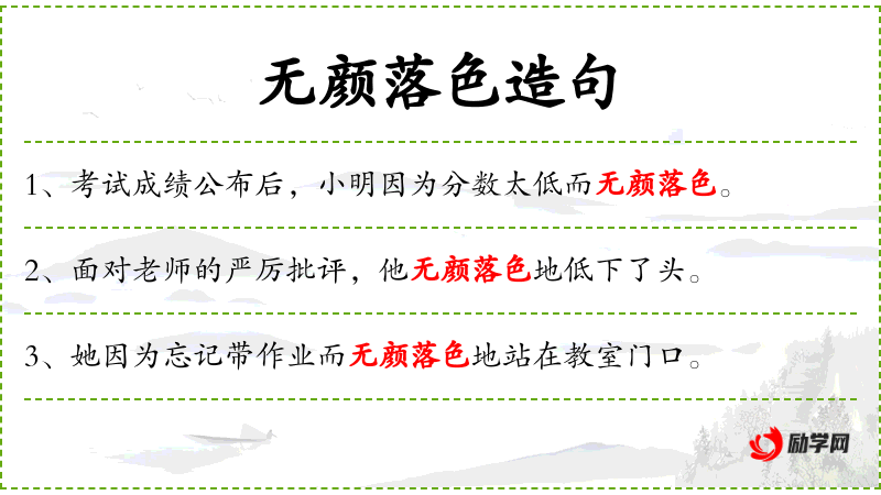 句子:“小华在全班面前回答不出问题,无颜落色地坐下了。”