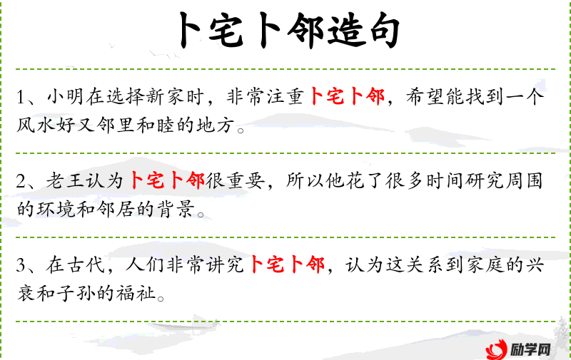 1. 【卜宅卜邻】 卜:占卜。迁居时不是先在住宅方面占卜吉凶,而是占卜邻居是不是可以为邻。指迁居应选择好邻居。