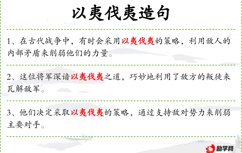 - 以夷伐夷:利用敌人的内部矛盾来攻击敌人,是一种策略。