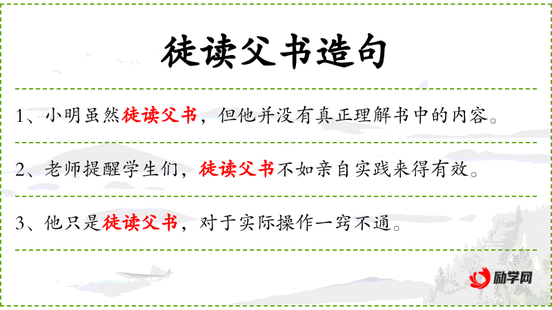 3. 【徒读父书】 徒:只。父书:父亲之言论。白读父亲的兵书。比喻人只知死读书,不懂得运用知识,加以变通。
